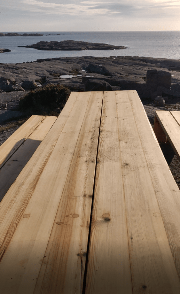 Eine weitere Besonderheit gibt es auf Ramsvik auch noch. Nämlich den Tisch von „The edible country“, einer Organisation verschiedener Unternehmen in und um Ramsvik. Dieser Tisch steht auf einem Hügel mit wunderschöner Aussicht. Über einen Link oder QR Code kann man sich den Platz zu einem bestimmten Zeitpunkt buchen und ein Restaurant aussuchen. Das Restaurant bringt das Essen und die Getränke dann zu dem Tisch hoch und man kann ein einzigartiges Dinner genießen. Romantik inklusive.