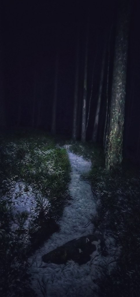 Die Stimme erstarb und mit ihr meine Zuversicht. Innerhalb kürzester Zeit wurde es dunkel. Wie das Jahr davor konnte man absolut nichts mehr sehen. Nur die Leuchtkegeln unserer Stirnlampen wiesen uns den Weg. Auf jeden Fall besser, als Handylampen, das mit Sicherheit. Doch nun waren meine Nerven bis zum zerreissen gespannt. Jeden Augenblick erwartete ich mit meinem Lichtkegel in die Augen eines wilden Tieres zu leuchten. Oder schlimmer, eines übernatürlichen Wesens!