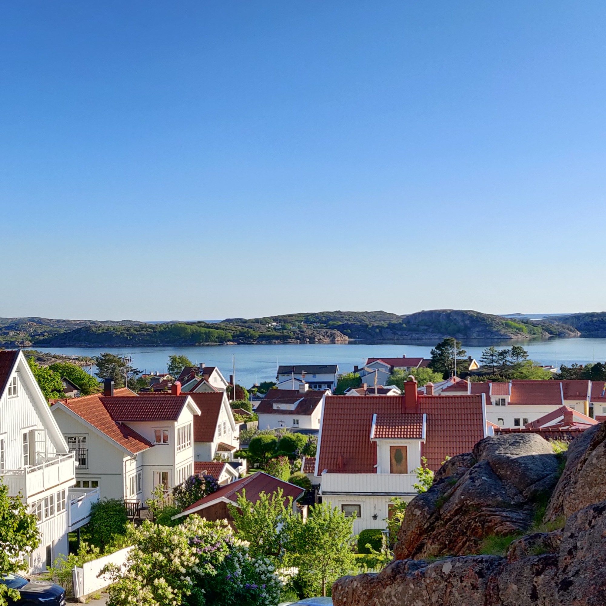 Davon abgesehen ist dieser Ort natürlich wunderschön. Wie fast überall im Bohuslän haben die Häuser einen ganz gewissen Charme. Fast alle Häuser sind weiß gestrichen, haben blaue oder rote Fensterläden und Verzierungen an Türen, Fenstern und Dächern. Ausladende Gärten stehen jetzt im Sommer in voller Blüte und überall wachsen Fliederbüsche. Weiße, lilafarben oder dunkelviolet. Der Geruch ist betörend und schwebt durch die stillen Straßen.