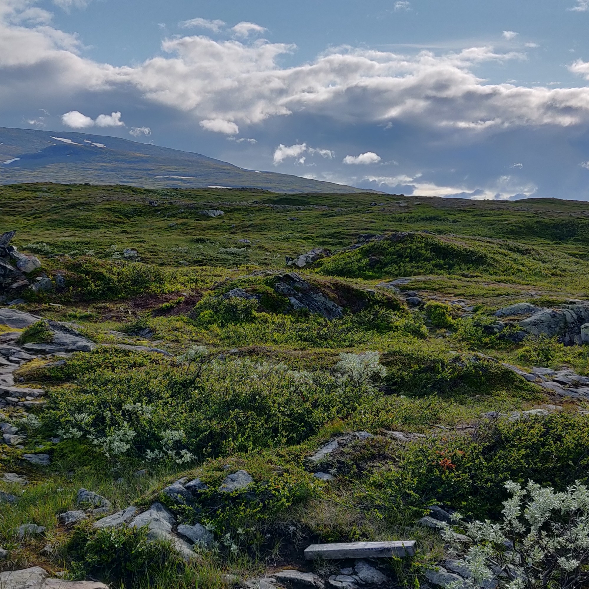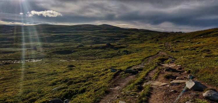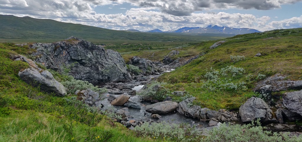 Die Landschaft verändert sich, während man läuft, relativ schnell. Von bergig zu flach, steinig und mit weiten Grasflächen. Bislang haben wir jede Menge wilder Rentiere gesehen, kleinere Tierchen in der Weite, die sich schnell in den Boden gegraben hatten und jede Menge Mücken.