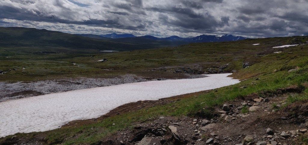 Zunächst muss man die 3km wieder hinab, die man am gestrigen Abend aufgestiegen ist. Und dann wendet man sich in die andere Richtung. Es geht bergauf. Nicht steil, dafür sehr sehr lange. Denn nun müssen wir einen kleinen Berg – vielleicht doch eher einen Hügel – passieren. Auf der Spitze liegt hier und da noch ein wenig Schnee, obwohl es Juni ist. Schließlich muss man etwa 400 Höhenmeter hinauf und dann wieder etwa 360 hinab.
