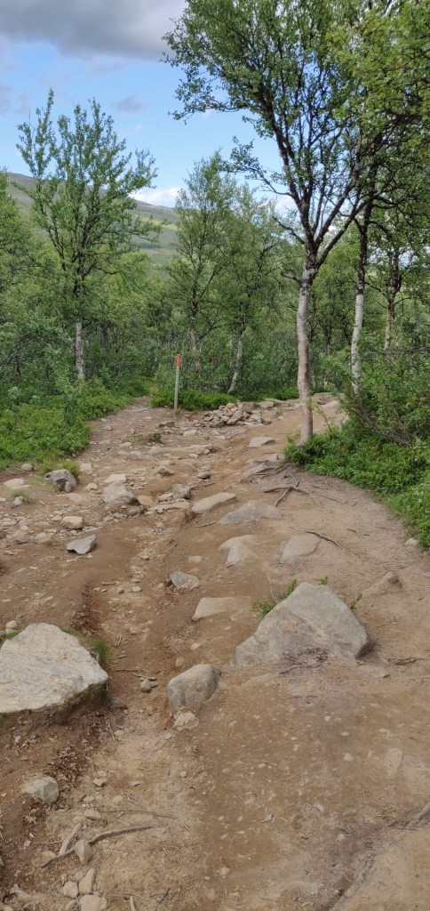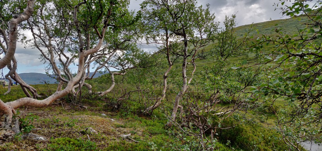 Je weiter wir in Richtung Storulvån unterwegs waren, desto mehr änderte sich alles um uns herum. Das Grün wurde satter, kleine, gebeugte Bäume wuchsen auf einmal um uns herum und wir sind sogar ein paar Meter durch einen kleinen Wald gelaufen. Wobei man selbst fast höher gewachsen war, als die Bäume hier.